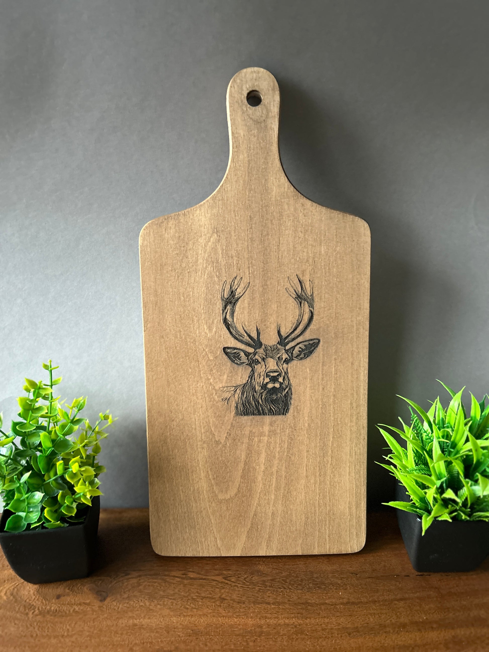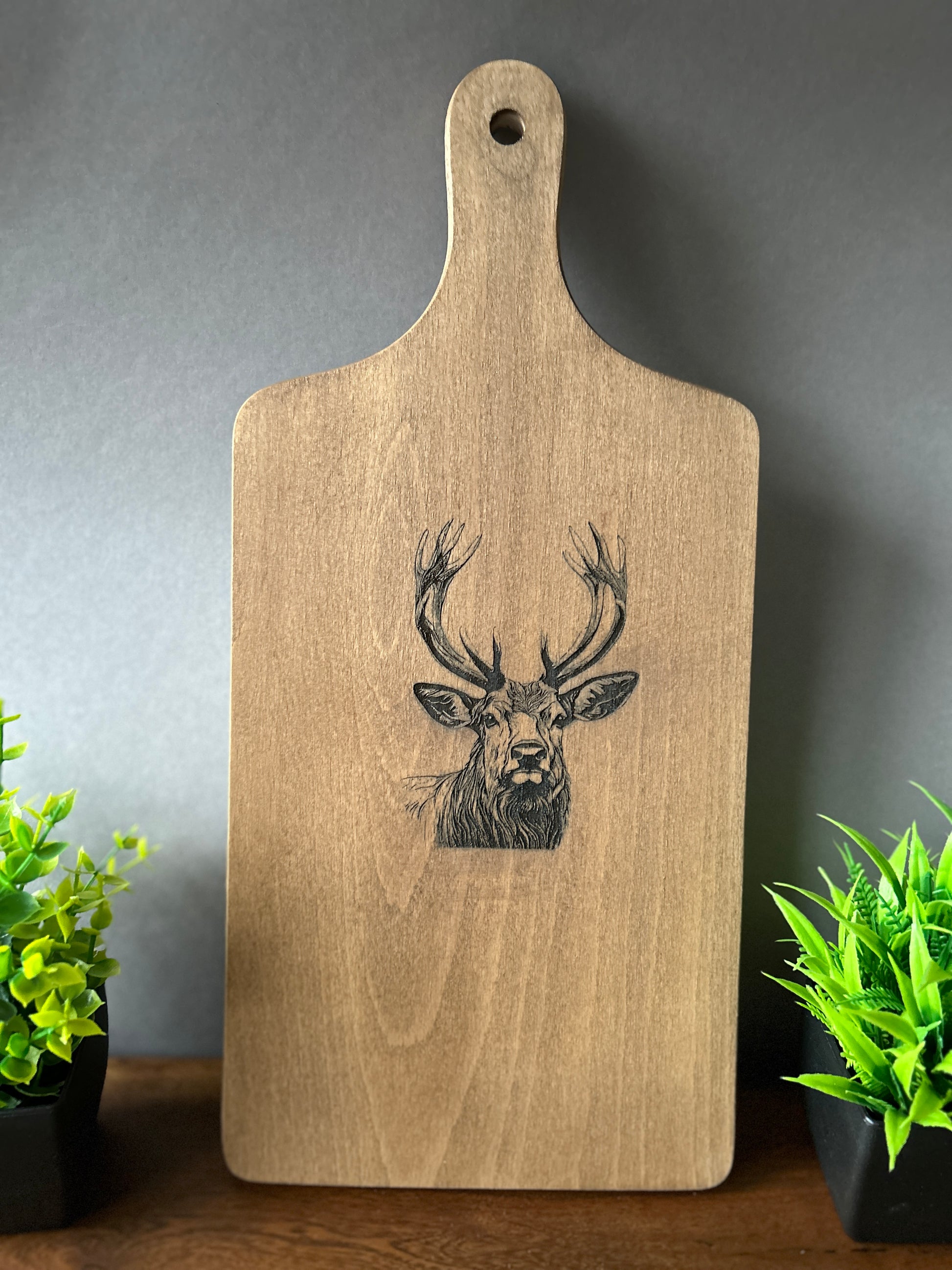 Schneidebrett aus Buchenholz mit Hirsch Gravur, 40 x 18 x 1,5 cm, Schneidebrett aus massivem Buchenholz mit eigenem Text gestalten