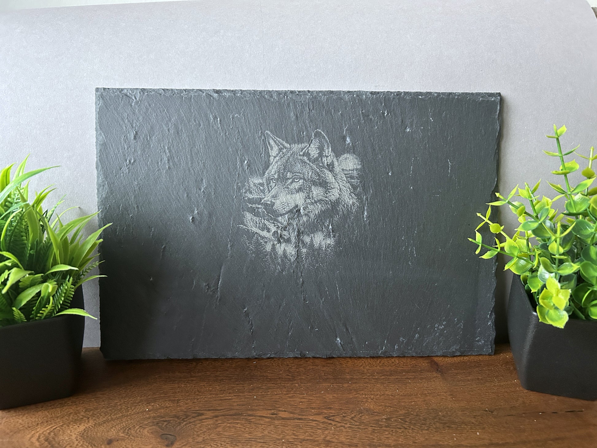 WAS Germany Naturschiefer-Servierplatte, mit Wolf Motiv, Schiefertafel personalisierbar mit Gravur 30 × 20 x 0,6 cm, für Käse, Sushi und Antipasti